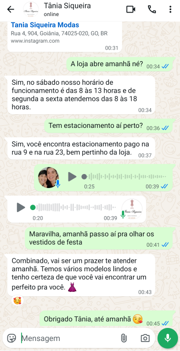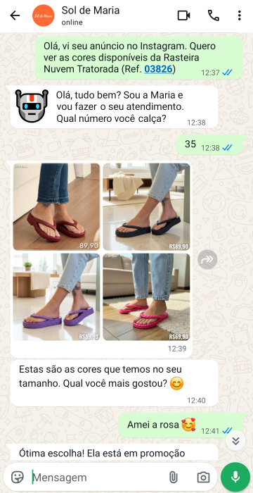 O agente entende e envia texto, áudio, imagem, link e documentos diversos. Treinado com as informações da sua empresa e produtos, ele realmente responde como um vendedor. Você nem percebe que está falando com um agente de inteligência artificial.