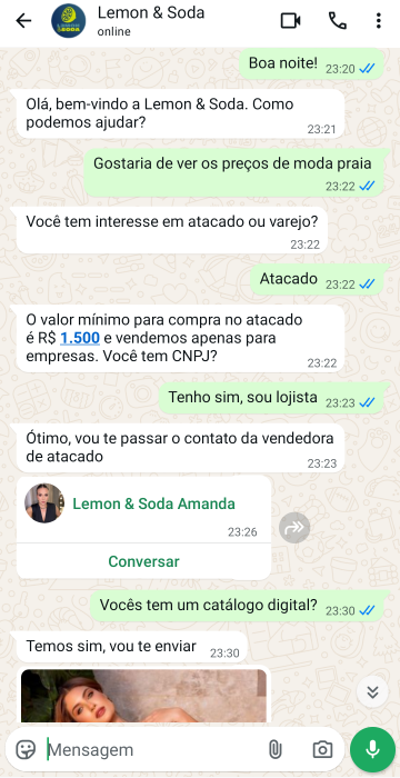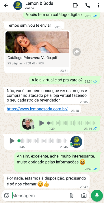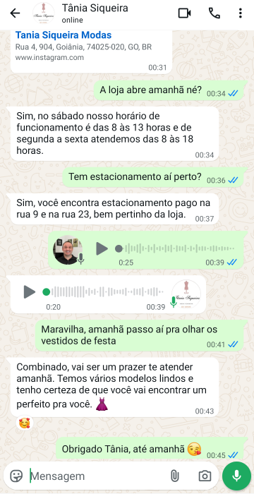O agente entende e envia texto, áudio, imagem, link e documentos diversos. Treinado com as informações da sua empresa e produtos, ele realmente responde como um vendedor. Você nem percebe que está falando com um agente de IA.