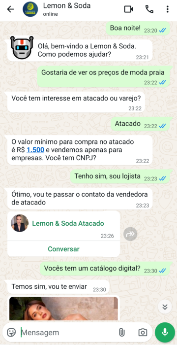 Nosso agente leva a conversa até onde for configurado mas o vendedor pode intervir a qualquer momento. Ele aprende com o tempo e melhora a cada dia. Com informação suficiente é capaz de conduzir a conversa até o fechamento da venda.